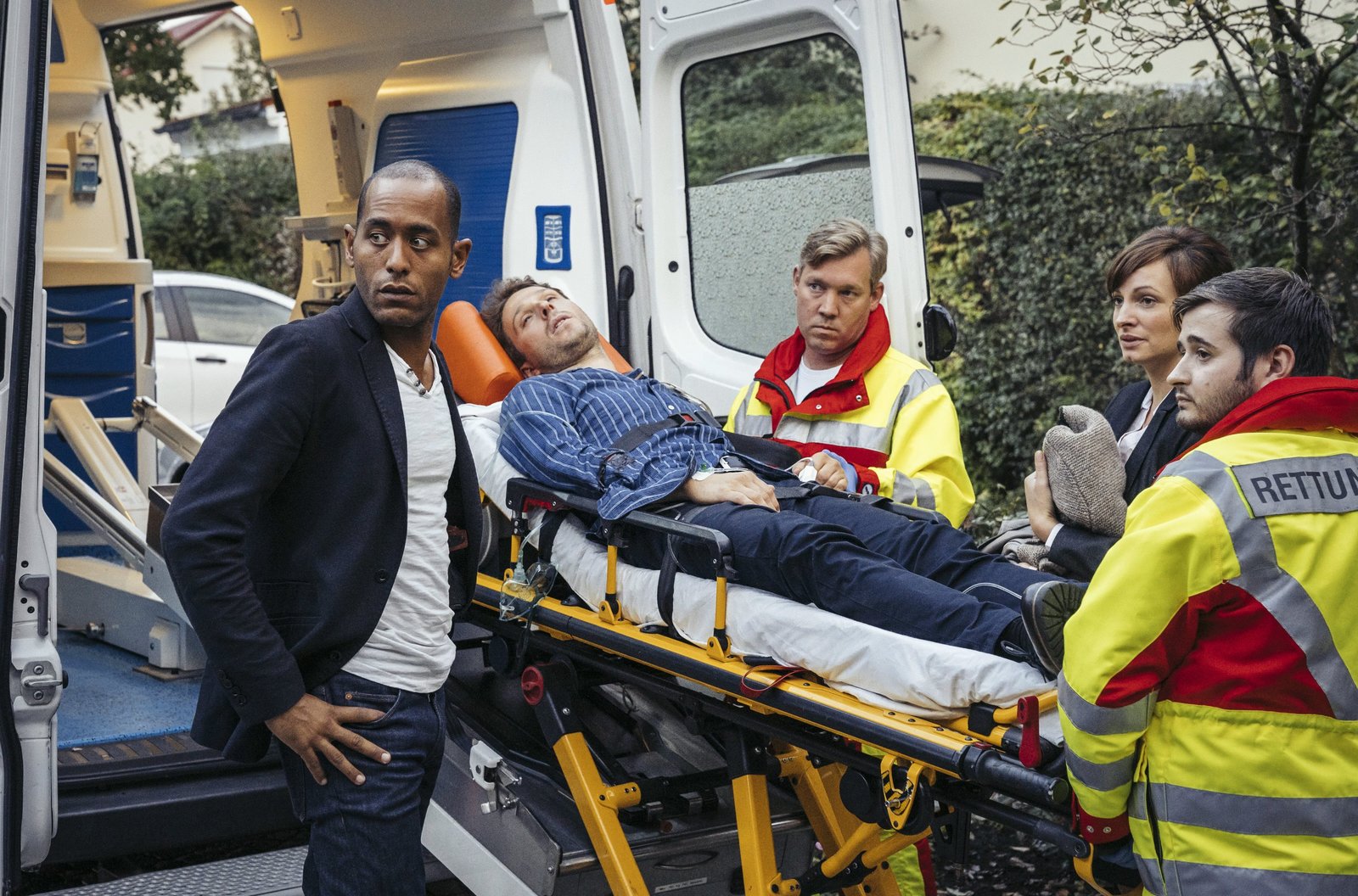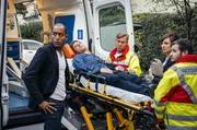 InkognitoChristian Bichler (Pablo Sprungala, auf der Bahre) ist niedergestochen worden. Felicitas Beck (Dagny Dewath, 2.v.r.) begleitet ihn in den Unfallwagen. Kommissar Jerry Paulsen (Peter Marton, l.) kommt dazu. Sanitäter (Komparsen)Bild: © "Bild: ARD/Hendrik Heiden (S2). ARD-Programmdirektion/Bildredaktion
