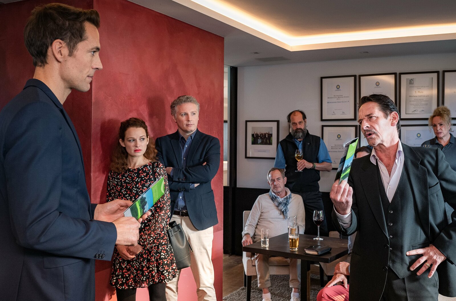 AbschlagGroße Versammlung beim Berchtesgadener Golfplatz: Der Golftrainer Toni Brendel (Alexander Mazza, l.) hat ambitionierte Pläne was die Zukunft des Golfplatzes angeht. Der Clubpräsident Julius Greiner (Max Tidorf, r. mit Komparsen im HG.) ist gegen einen Ausbau. Im Bild v.l.n.r. Toni Brendel (Alexander Mazza), Franziska Schachtner (Lilian Naumann), Leo Fischer (Max Urlacher), Julius Greiner (Max Tidorf)Bild: © ARD/Lucky Bird Pictures/Andreas Steffan