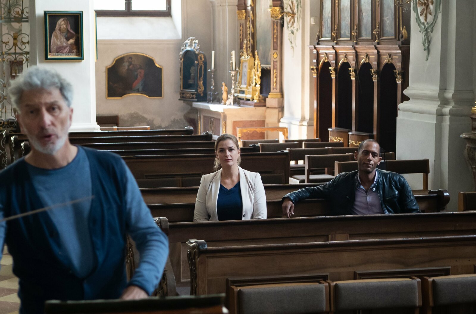 Dritter FrühlingGerti Vogt (Veronika von Quast, l.) und Fritz Sturm (Michael Schwarzmaier, M.), die Freunde der Ermordeten, mutmaßen über den Mörder.Bild: © ARD/Lucky Bird Pictures/Raymond Roemke