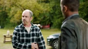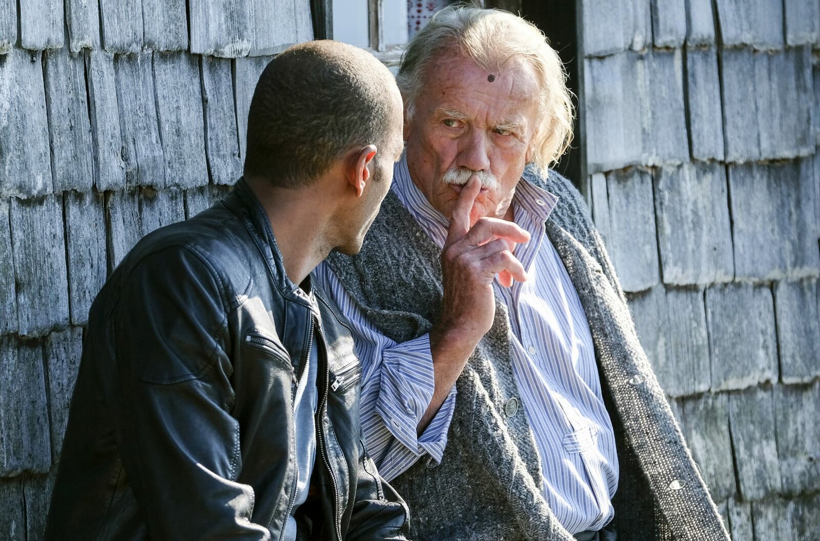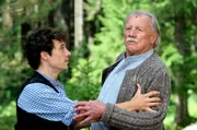 Der Alte vom BergJerry Paulsen (Peter Marton, l.) sitzt mit Josef Lahner (Franz Buchrieser, r.) vor dessen Hütte auf der Bank - der vertraut ihm ein dunkles Geheimnis an.Bild: © "Bild: ARD/Susanne Bernhard (S2). ARD-Programmdirektion/Bildredaktion