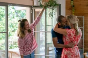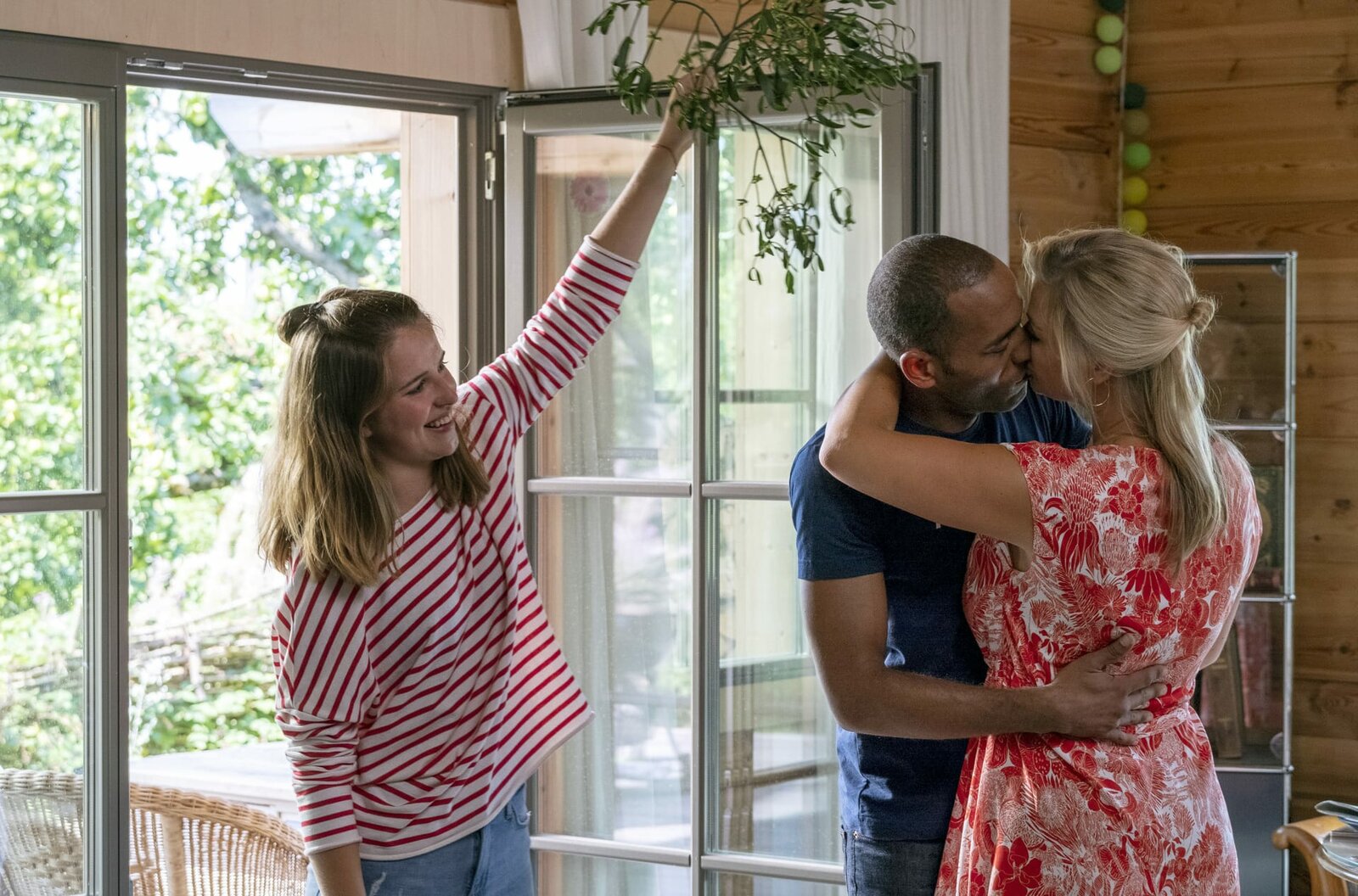 Der Tote von der BobbahnJohanna Beissl (Ines Lutz, r.) und Jerry Paulsen (Peter Marton, M.) küssen sich unter einem Mistelzweig, den Schwester Eva Beissl (Leonie Brill, l.) über die beiden hält.Bild: © "Bild: ARD/Susanne Bernhard (S2). ARD-Programmdirektion/Bildredaktion
