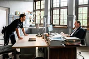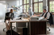 Der Tote von der BobbahnDer Mannschaftsarzt des Bobteams vom SV Königssee wurde tot aufgefunden, erschlagen im Trainingscenter. Jerry Paulsen (Peter Marton, l.) und Benedikt Beissl (Andreas Giebel, r.) sitzen an ihren Schreibtischen und sprechen über die Ermittlungsergebnisse, die sie bis jetzt in diesem Fall zusammengetragen haben.Bild: © "Bild: ARD/Susanne Bernhard (S2). ARD-Programmdirektion/Bildredaktion