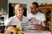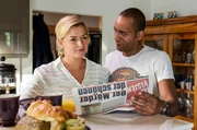 Kalkül oder LiebeJohanna Beissl (Ines Lutz, l.) und Jerry Paulsen (Peter Marton, r.) lesen beim Frühstück die aktuelle Zeitung.Bild: © "Bild: ARD/Susanne Bernhard (S2). ARD-Programmdirektion/Bildredaktion