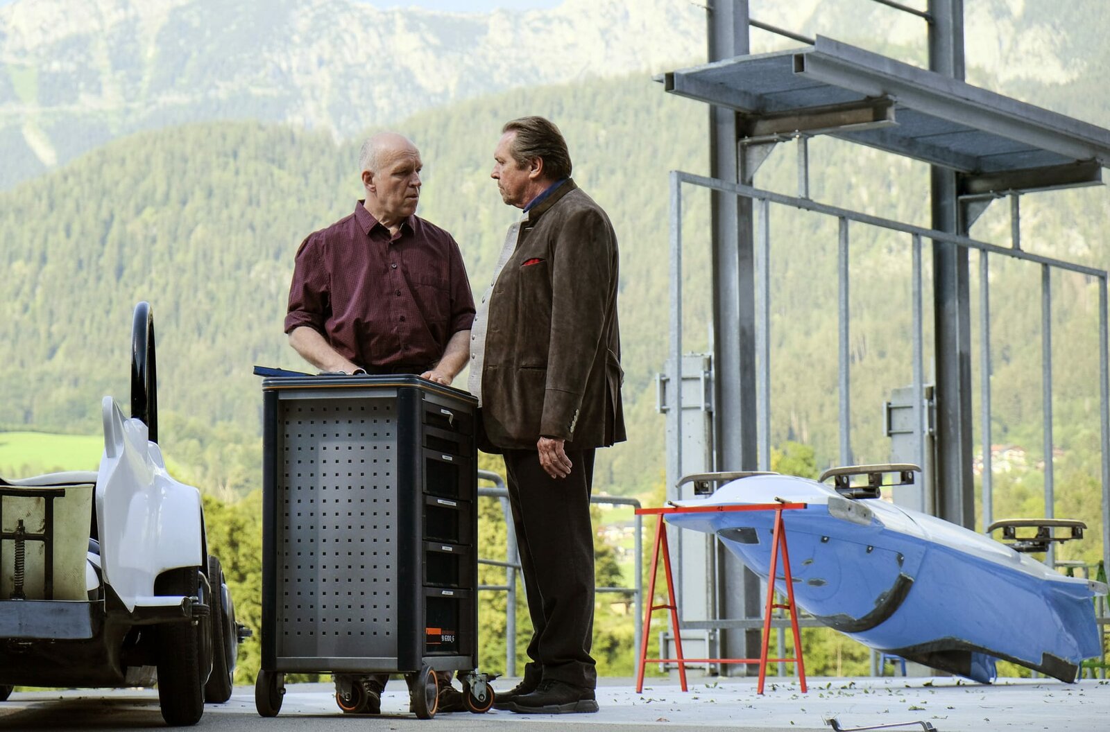 Der Tote von der BobbahnDer Mannschaftsarzt des Bobteams vom SV Königssee wurde tot aufgefunden, erschlagen im Trainingscenter. Im Bobteam brodelt es. Beissl (Andreas Giebel, r.) unterhält sich mit dem Servicemann Wiggerl Mittermeier (Heinz-Josef Braun, l.), der tatverdächtig ist.Bild: © "Bild: ARD/Susanne Bernhard (S2). ARD-Programmdirektion/Bildredaktion