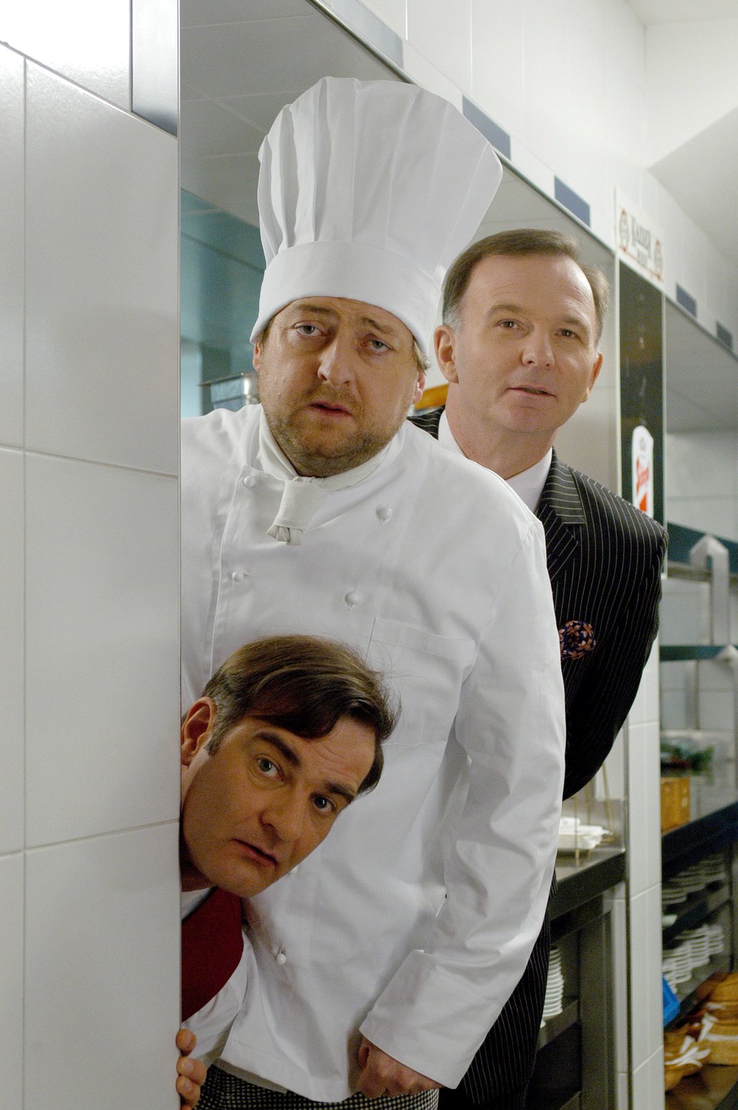 Kindsköpfe / Stern der BegierdeKellner Konrad (Heinrich Schafmeister, li.), Koch Hannes (Maximilian Krückl, mi.) und Chef Helmut (Michael Lerchenberg) beobachten die Essenstesterin im Restaurant.Bild: © ORF2