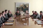 Ein neues LebenKonferenz im Ministerium für Staatssicherheit:Fassungslosigkeit nach dem Mauerfall: Gerd Rothals (Michael Schenk, 3.v.l.), Falk Kupfer (Jörg Hartmann, 4.v.l.), Günther Gaucke (Hansjürgen Hürrig, M. l.), Horst Schöning (Jürgen Heinrich, M.r.), Hans Kupfer (Uwe Kockisch (1.v.r.),Bild: © ARD-Programmdirektion