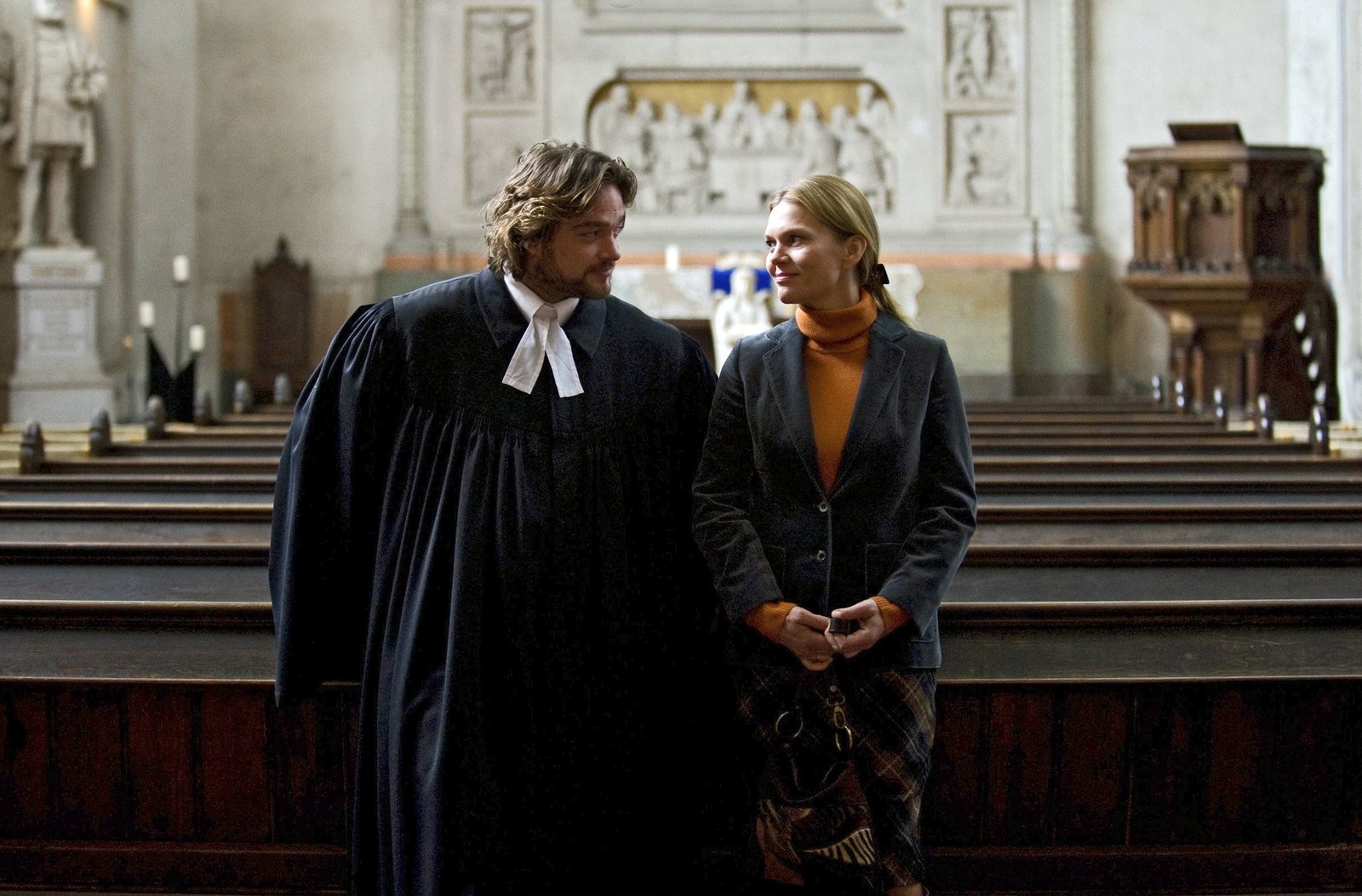 Die RückkehrVera Kupfer (Anna Loos, r.) lernt über ihre Freundin Nicole deren Bruder Robert Wolff (Ronald Zehrfeld, l.), Pfarrer der Kreuzkirchengemeinde kennen. Robert Wolff lädt Vera zu einer Informationsveranstaltung mit Punk-Konzert im Gemeindehaus ein.Bild: © ARD/Julia Terjung