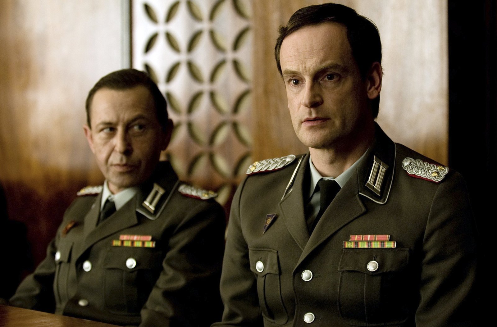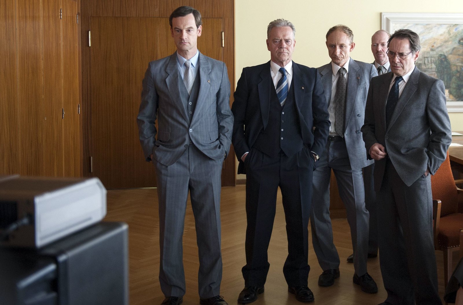 Einer von unsVerfolgen entsetzt Mielkes Rede: v.l.n.r. Falk Kupfer (Jörg Hartmann), Horst Schöning (Jürgen Heinrich), Gerd Rothals (Michael Schenk), Hans Kupfer (Uwe Kockisch) im Ministerium für Staatssicherheit.Bild: © ARD-Programmdirektion