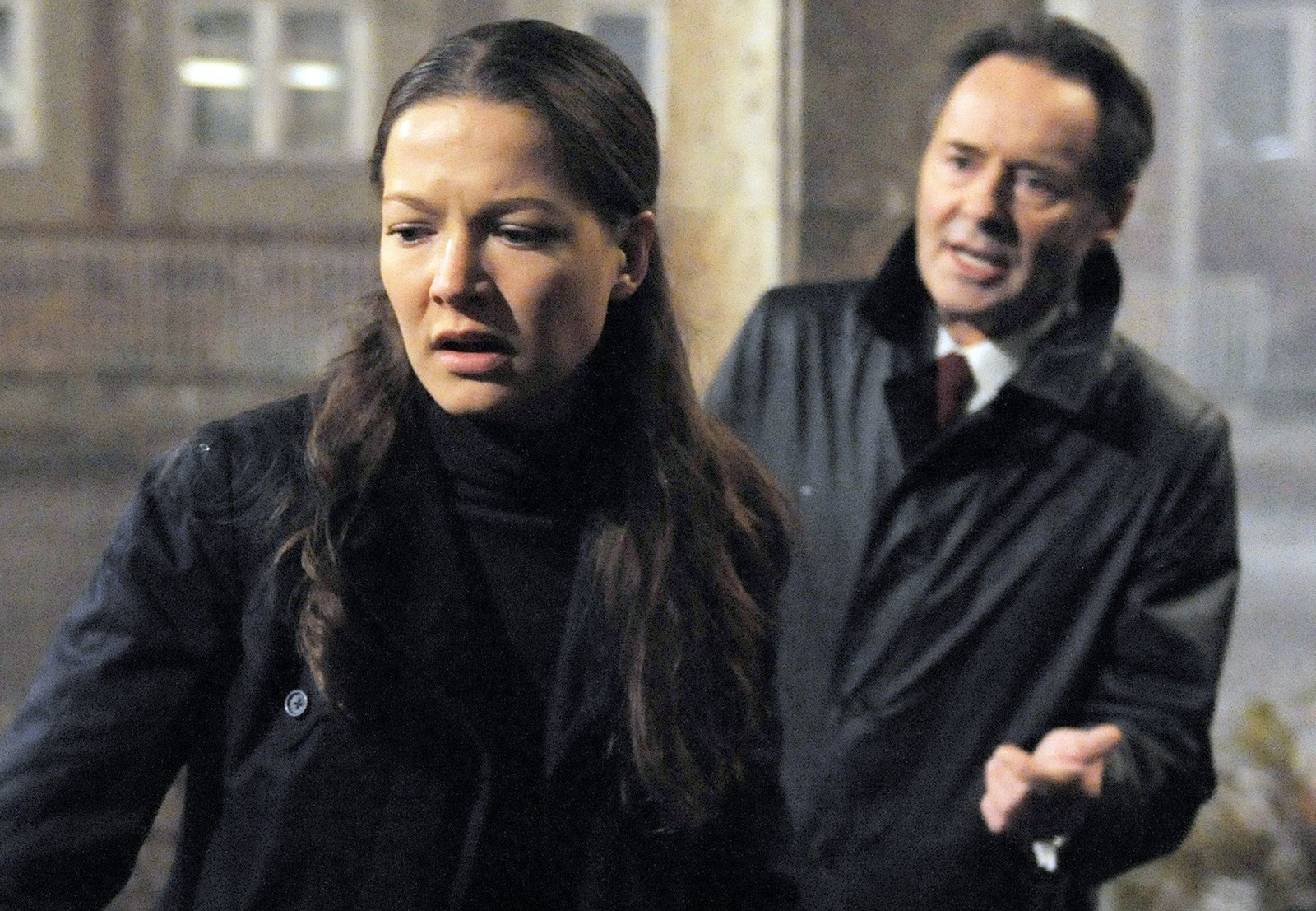 Eine Nacht im NovemberPfarrer Robert Wolff (Ronald Zehrfeld, r.) ahnt nicht, dass Falk (Jörg Hartmann, im HG.) ihn beschattet.Bild: © ARD-Programmdirektion