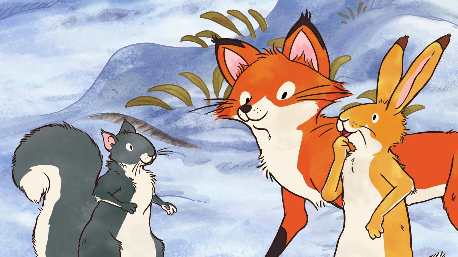 Spurlos verschwundenDie beiden braunen Hasen, die kleine Rotf??chsin und die kleine Feldmaus spielen im Schnee. Dabei entdecken sie eine Spur und folgen ihr.Bild: © KiKA/SLR Productions Australia Pty.Ltd./Scrawl Studios Pte Ltd./hr/ARD