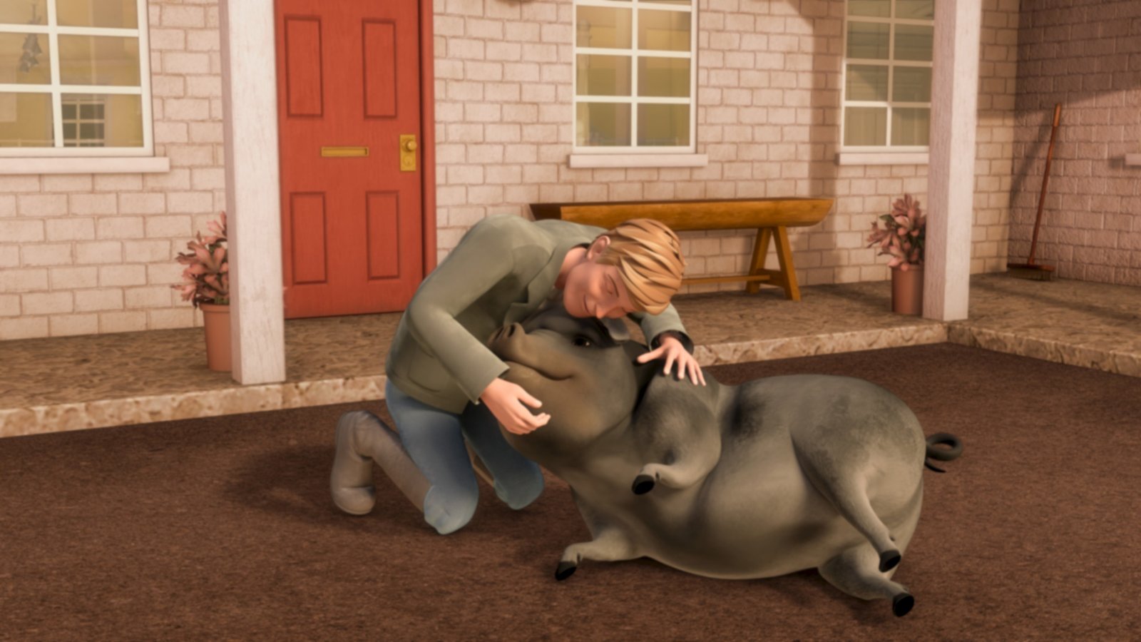 Vertrauen ist der SchlüsselGunnar freut sich, weil sein Schwein Elmer, das ausgebüxt war, wieder da ist.Bild: © ZDF/Wendy and Associated Characters (c) WPL 2012