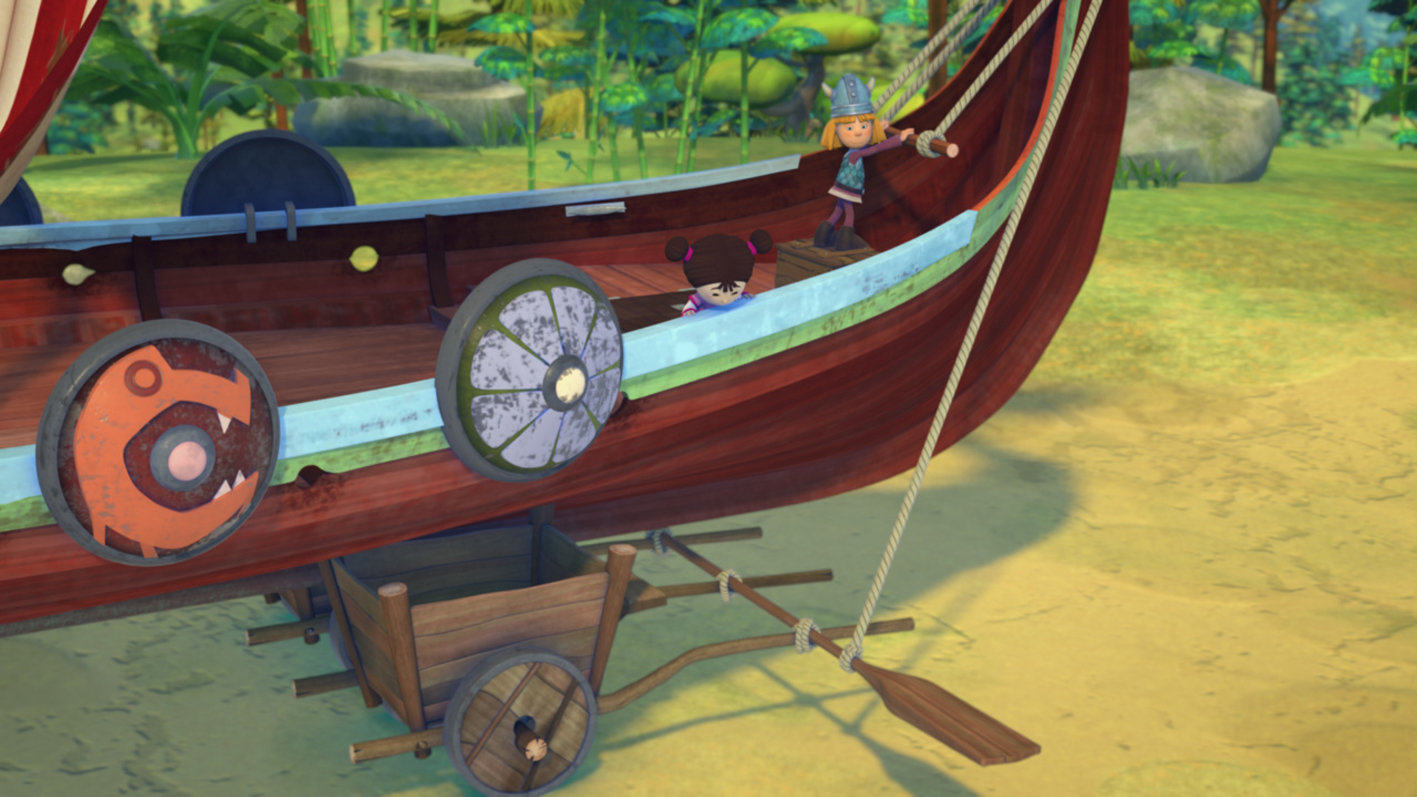 Das große Chinaabenteuer (3): Aufruhr im BambuswaldAus dem fliegenden Schiff ist ein rollendes geworden.Bild: © ZDF/studio 100media