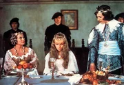 Die Königin (Milena Dvorska, li.) möchte, dass Dornröschen (Marie Horakova) und Prinz Georg (Jan Kraus, re.) heiraten. Dornröschen liebt aber jemand Anderen...Bild: © WDR