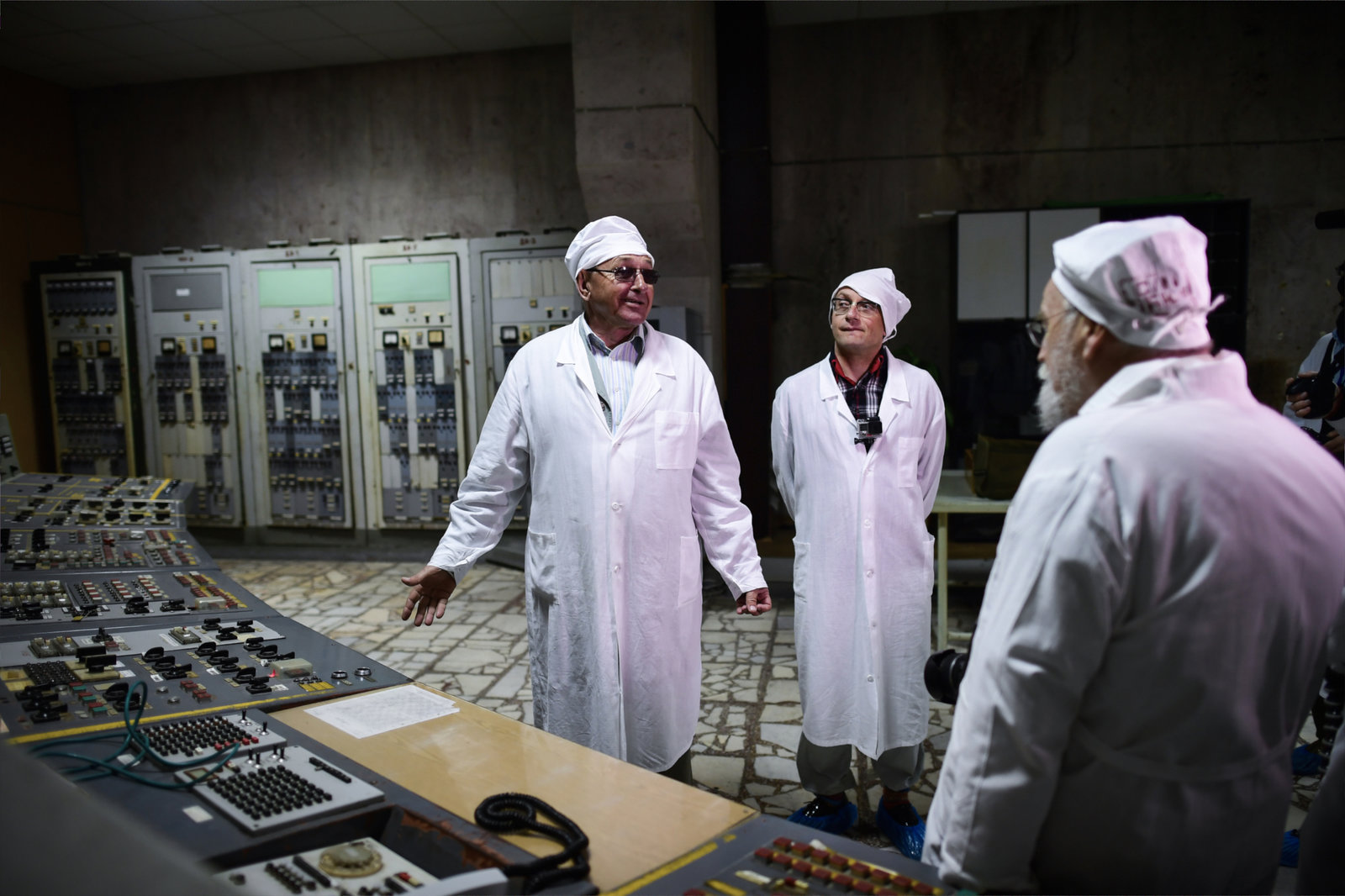 Todeszone TschernobylVolodimir Usatenko, Wigald Boning and Dr. Sebastian Pflugbeil stand inside the control room of reactor 4 of the Tschernobyl Nuclear Power Plant while on set during the shooting for the new local production 'Wigald & Fritz - Die Geschichtsjaeger' by the German TV channel HISTORY on April 13, 2016 in Tschernobyl, Ukraine.Bild: © History