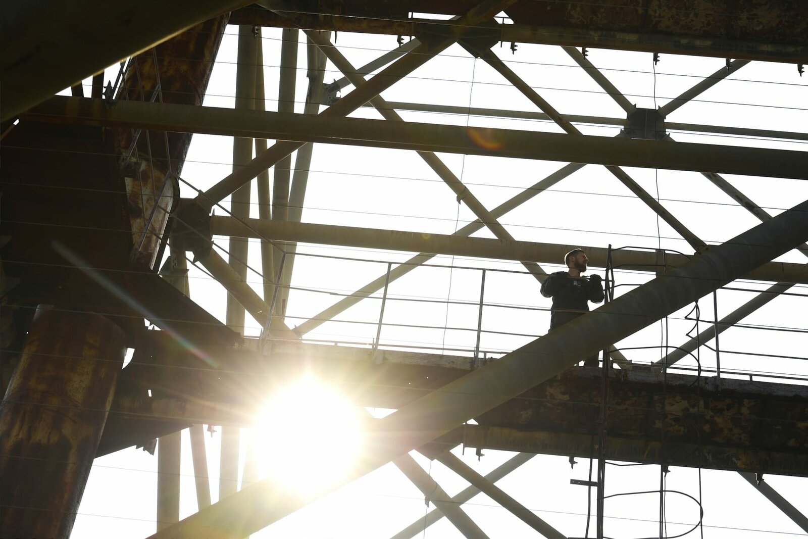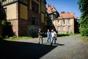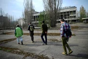 Todeszone TschernobylFritz Meinecke, security guide Alexey, Wigald Boning and local guide Taras are seen on set during the shooting for the new local production 'Wigald & Fritz - Die Geschichtsjaeger' by the German TV channel HISTORY on April 12, 2016 in Pripyat, Ukraine.Bild: © History