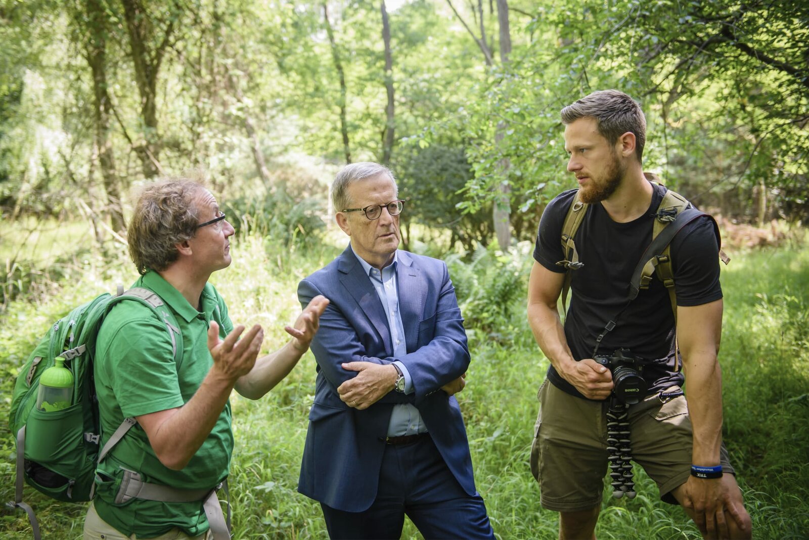Hitlers RaketenschmiedeFriedrich 'Fritz' Meinecke (L) and Wigald Boning and Christoph von Braun on the set during the shooting at the Schorfheide for the new local production 'Wigald & Fritz - Die Geschichtsjaeger' by the German TV channel HISTORY on July 5, 2016 in Peenemuende, Germany.Bild: © History