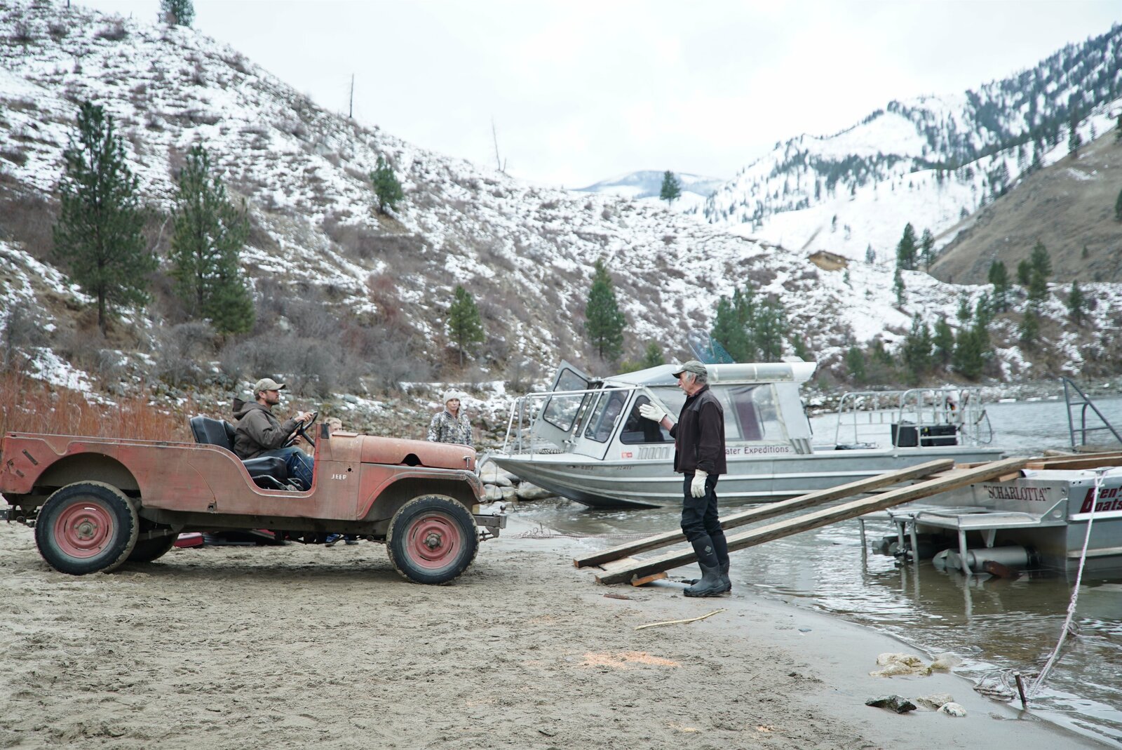 Der Frühling hält EinzugL-R: Buck Dewey, Heinz Sippel and Joni Dewey working to get the jeep on the boat.Bild: © Discovery Channel