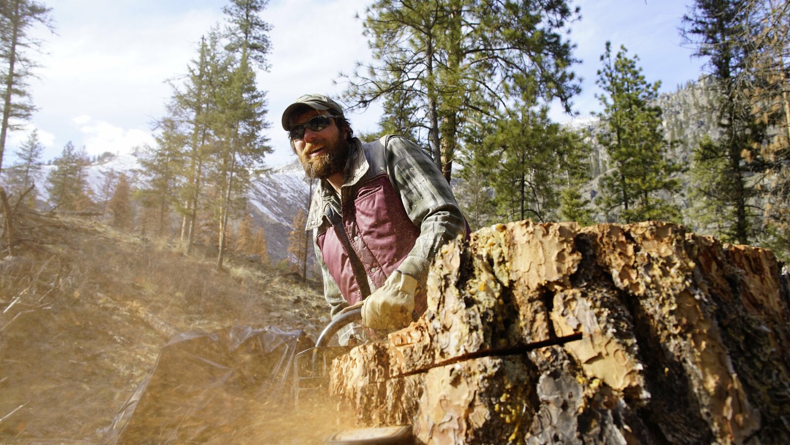 Die South Fork RanchWes Gregory sawing down a tree, smiling.Bild: © Peter McCabe / Discovery Communications, LLC / Discovery Channel