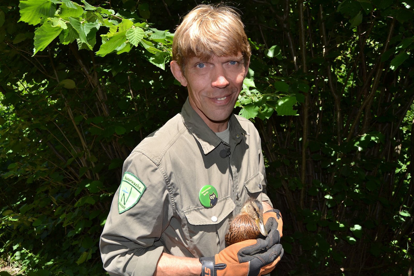 Von kranken Igeln und jungen EichhörnchenBerlin ist nicht nur voller Menschen und Autos, die Hauptstadt kann auch mit einer außergewöhnlich großen, tierischen Artenvielfalt aufwarten - mehr als 50 Säugetier- und rund 180 Vogelarten hat die Hauptstadt zu bieten. Dank ausgedehnter Grünflächen und vielen Gewässern finden immer mehr tierische Bewohner den Weg in die Stadt. Immer öfter kommt es zu spannenden Begegnungen mit Wildtieren. - NaturRanger Björn Lindner (Leiter der Naturschutzstation Marienfelde) hält eine junge Stockente im Arm.Bild: © rbb