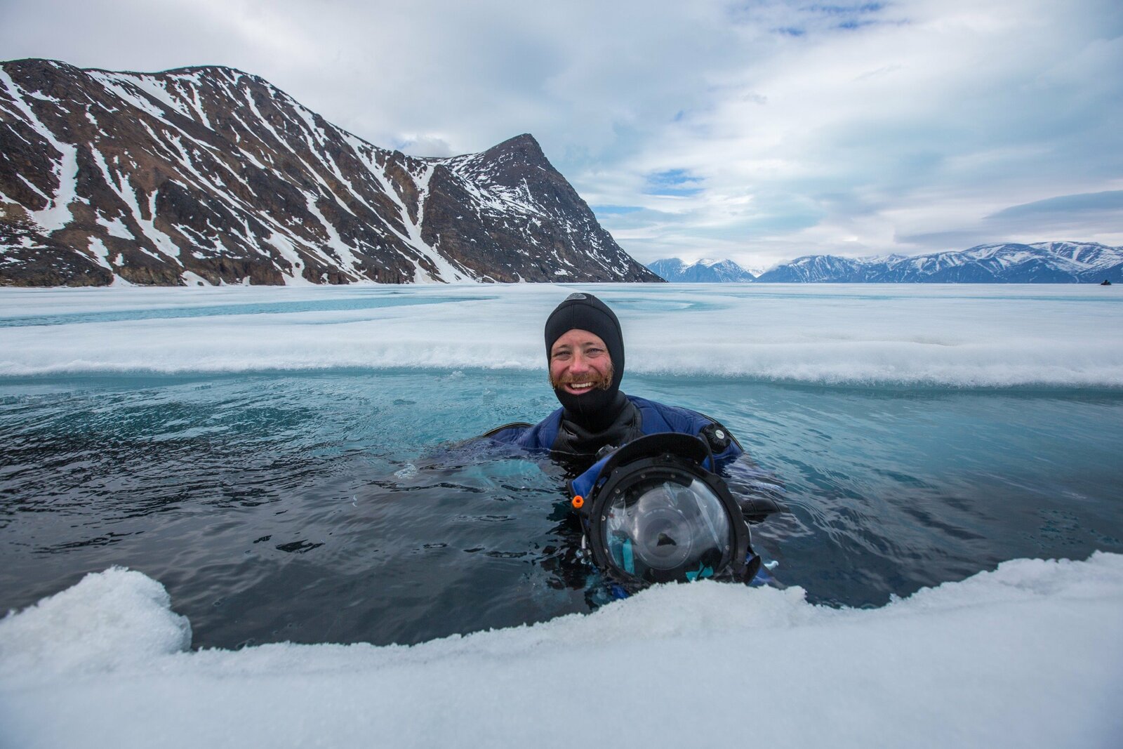 Der hohe NordenFotograf und Kamera Assistent Kieran O?Donovan im Wasser entlang der EiskanteBild: © TVNOW / © Brian Leith Produc tions / Terra Mater_Justin Maguire