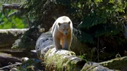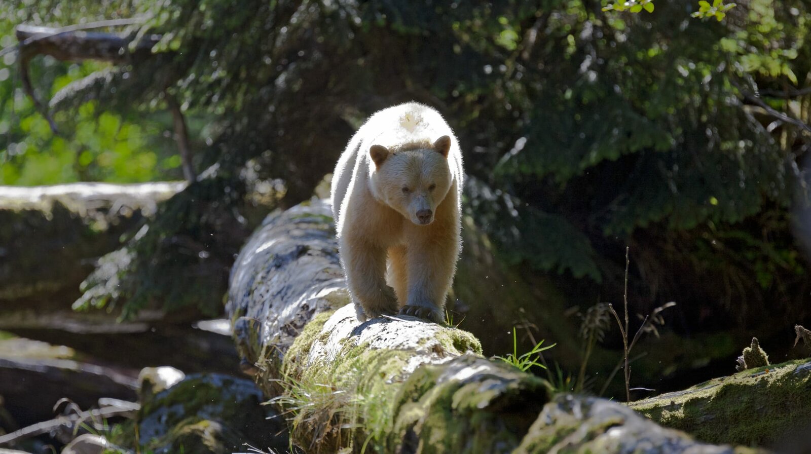 Das ewige NeulandEin „Geisterbär“ (Kermodebär) läuft auf einem liegenden Baumstamm.Bild: © phoenix/WDR/Kieran O'Donovan