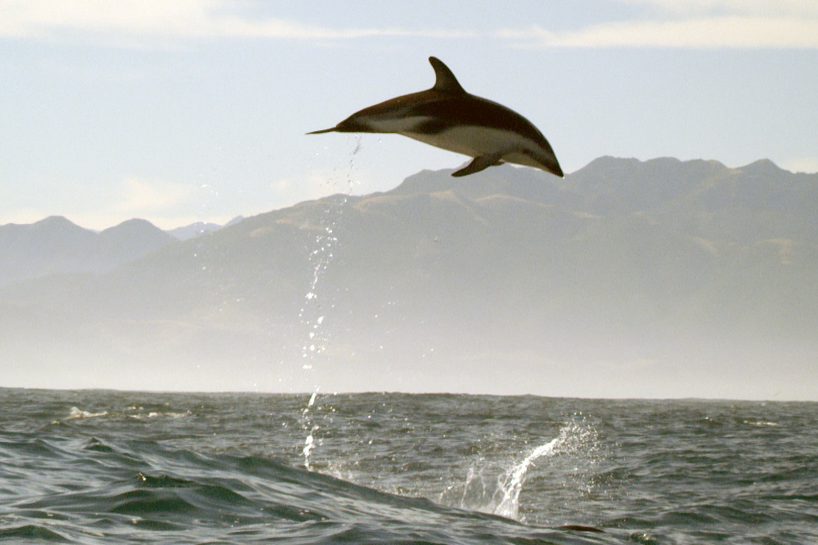Im Reich der Extreme15: Schwarzdelfine kommunizieren nicht nur über ihr Sonar und verschiedene Klicklaute miteinander. Auch mit ihren Sprüngen und der Art, wie sie ins Wasser tauchen, geben sie sich gegenseitig Signale.Bild: © NDR / © Doclights NDR Naturfilm & BBC