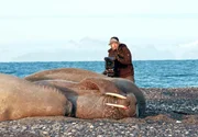 Von Dänemark bis zum Nordkap - Das AbenteuerImmer auf dem Sprung: Tierfilmer Jan Haft hält Sicherheitsabstand. Obwohl Walrosse an Land plump wirken, sollte man ihnen nicht zu nahe kommen. Mit ihren mächtigen Hauern, können sie schwere Wunden reißen.Bild: © BR/NDR/Jan Haft