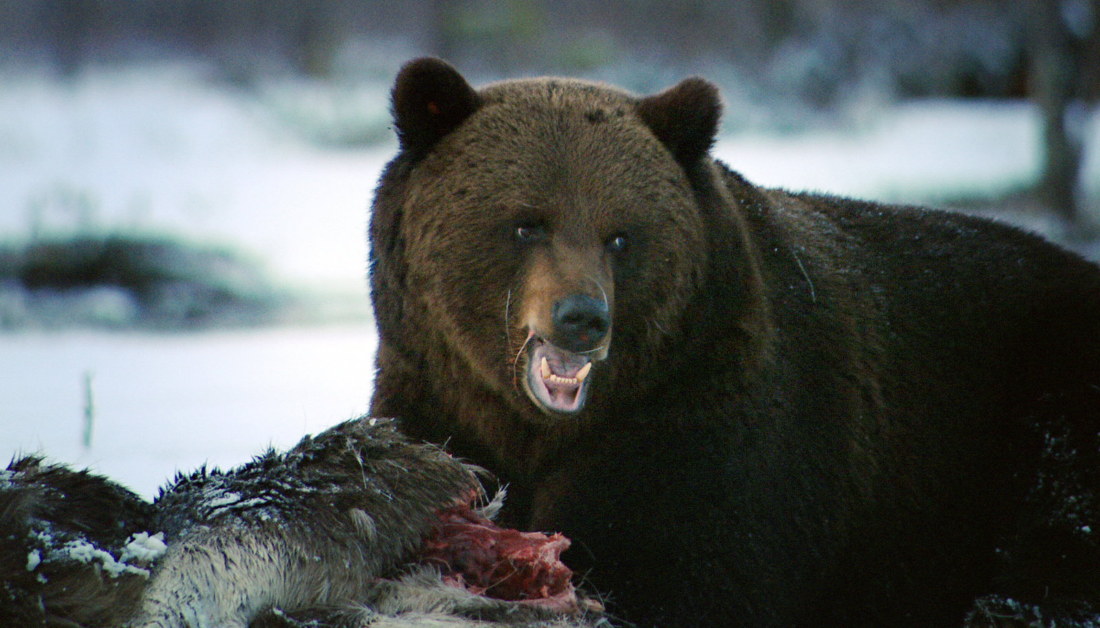 Finnland - Inselmeer und SeenlandKeinen Spaß versteht der Braunbär, der gerade erst aus dem Winterschlaf erwacht ist. Um nichts an Raben oder Vielfraße zu verlieren, schläft er sogar beim Elchkadaver.Bild: © PHOENIX/NDR/NDR Naturfilm