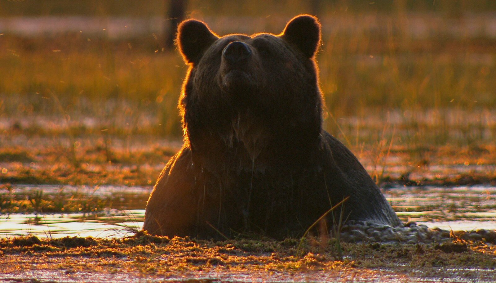 SchwedenUm sich vor den unzähligen Mücken zu schützen, nimmt der Braunbär ein Bad im Sumpf.Bild: © ZDF und NDR/Naturfilm.