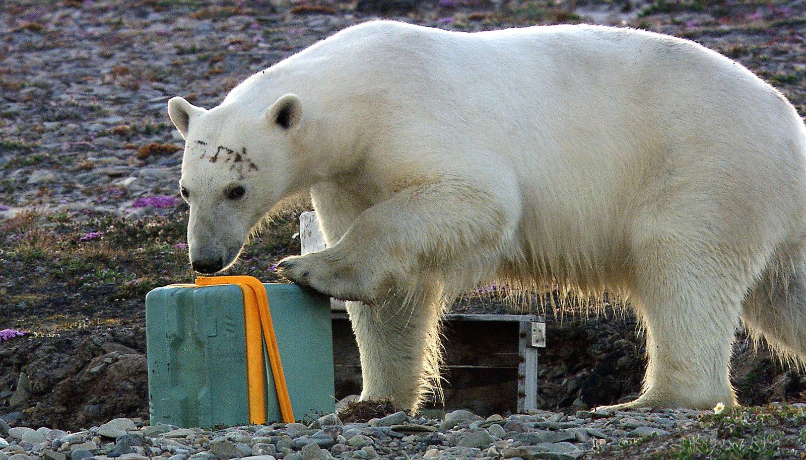 Grönland - Das Reich der EisbärenAls wüsste er genau, wie man Kühlboxen öffnet: Nahezu routiniert geht ein Eisbär im Nordwesten Grönlands vor, um an den Inhalt der Vorratskiste zu kommen.Bild: © HR/NDR/Uwe Anders