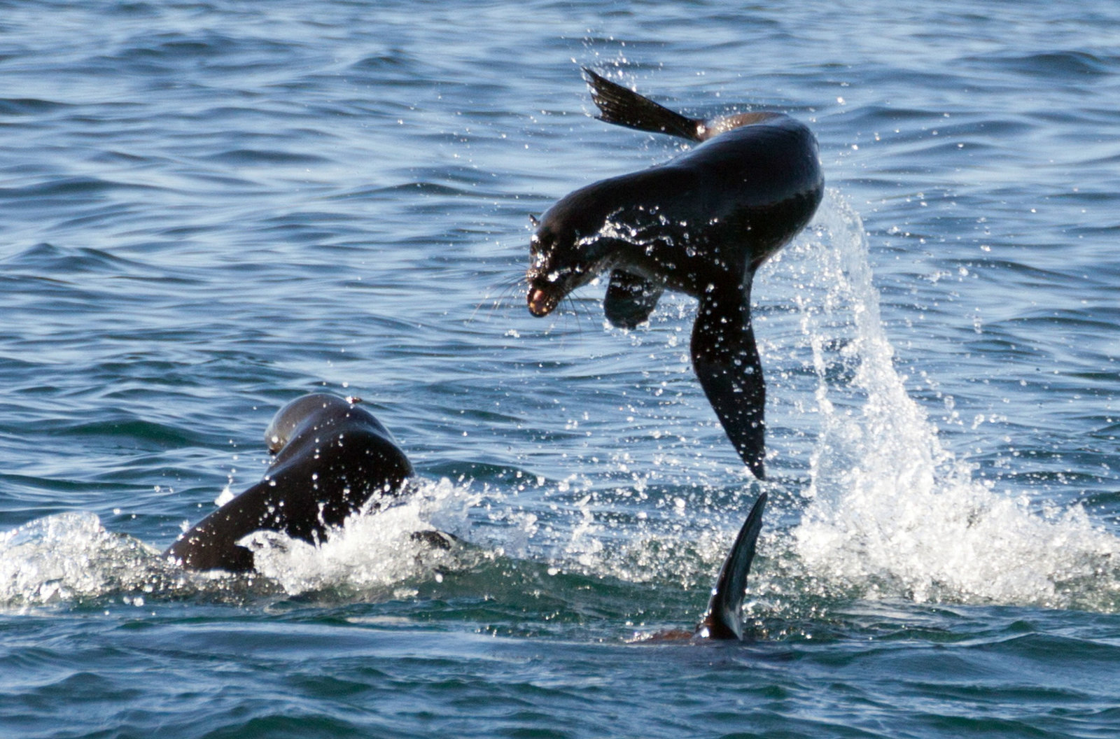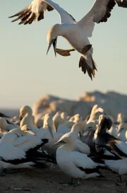 Kap der ExtremeEine Gruppe Seebären begibt sich auf die Jagd nach Kaptölpel-Jungen, die bei ersten Flugversuchen ins Wasser stürzen.Bild: © NDR/NDR/Doclights/Michael Riegler
