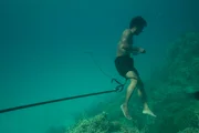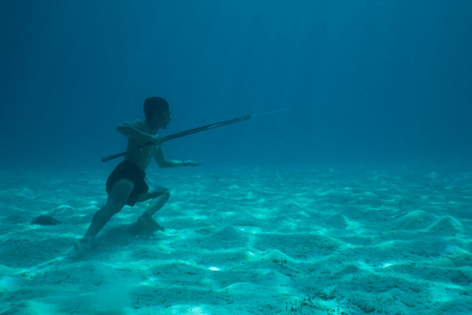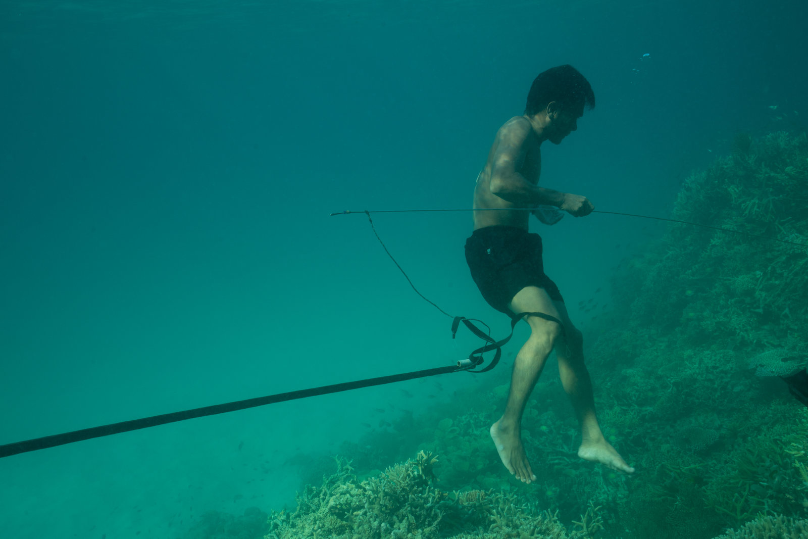 FluchtKabalutan, Central Sulawesi, INDONESIA - Fandi, an expert Bajau Laut fisherman, shows the OSR crew his freediving prowess as he hunts for fish with his handmade spear gun.Bild: © National Geographic