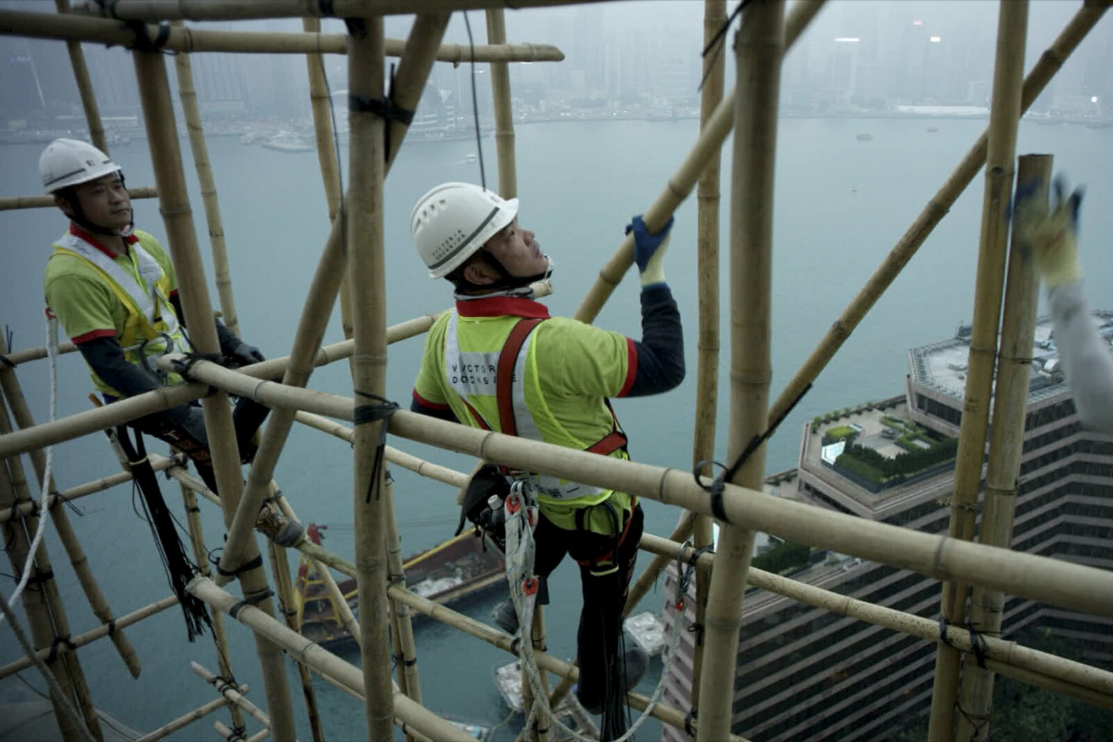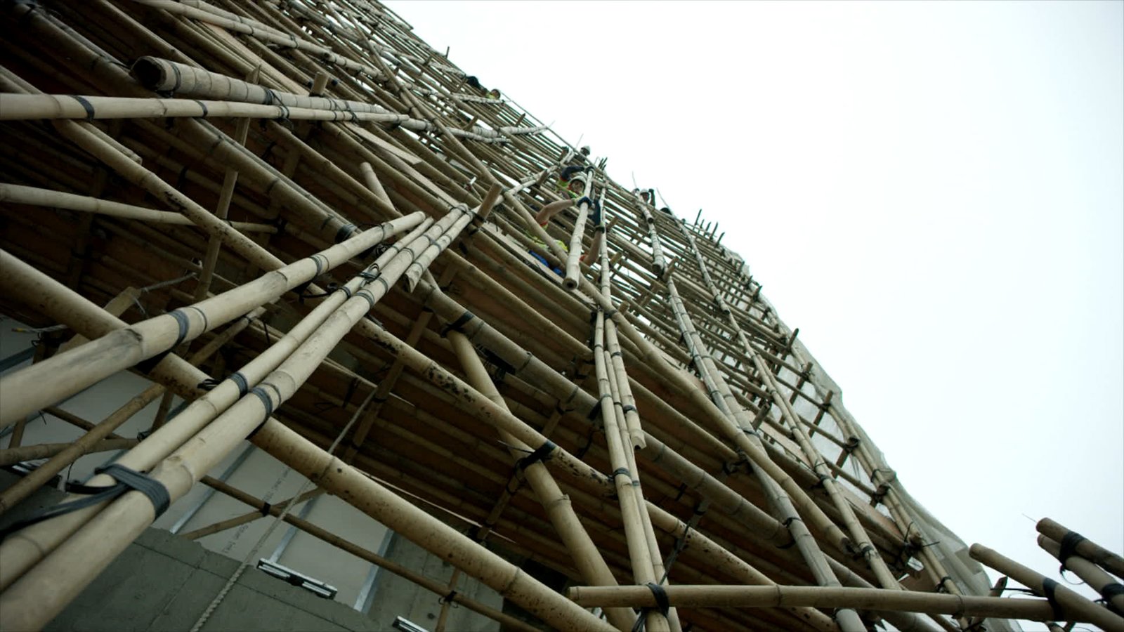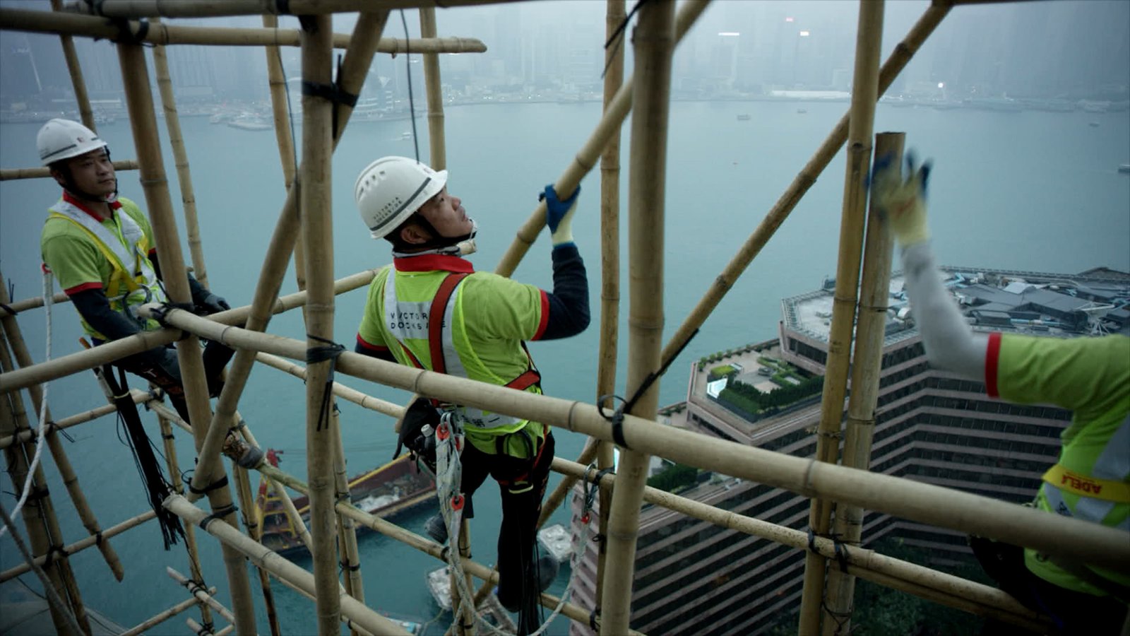 TerraformingTsim Sha Tsui, Hongkong: Zehn Meter lange Bambusstangen werden von den erfahrenen Ingenieuren von Hand übergeben. Sie sind mit starken, aber flexiblen Nylonsträngen verbunden. Die Flexibilität des Bambus und der Fäden erlaubt es dem Bambusgerüst, selbst die stärkeren Taifune in Hongkong zu überleben.Bild: © ZDF und National Geographic.
