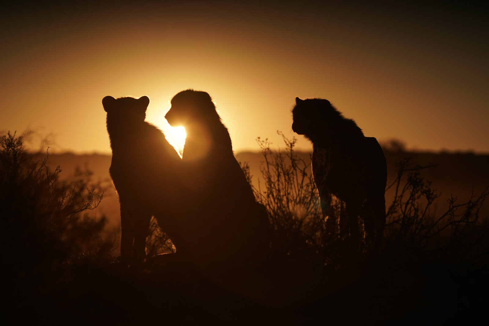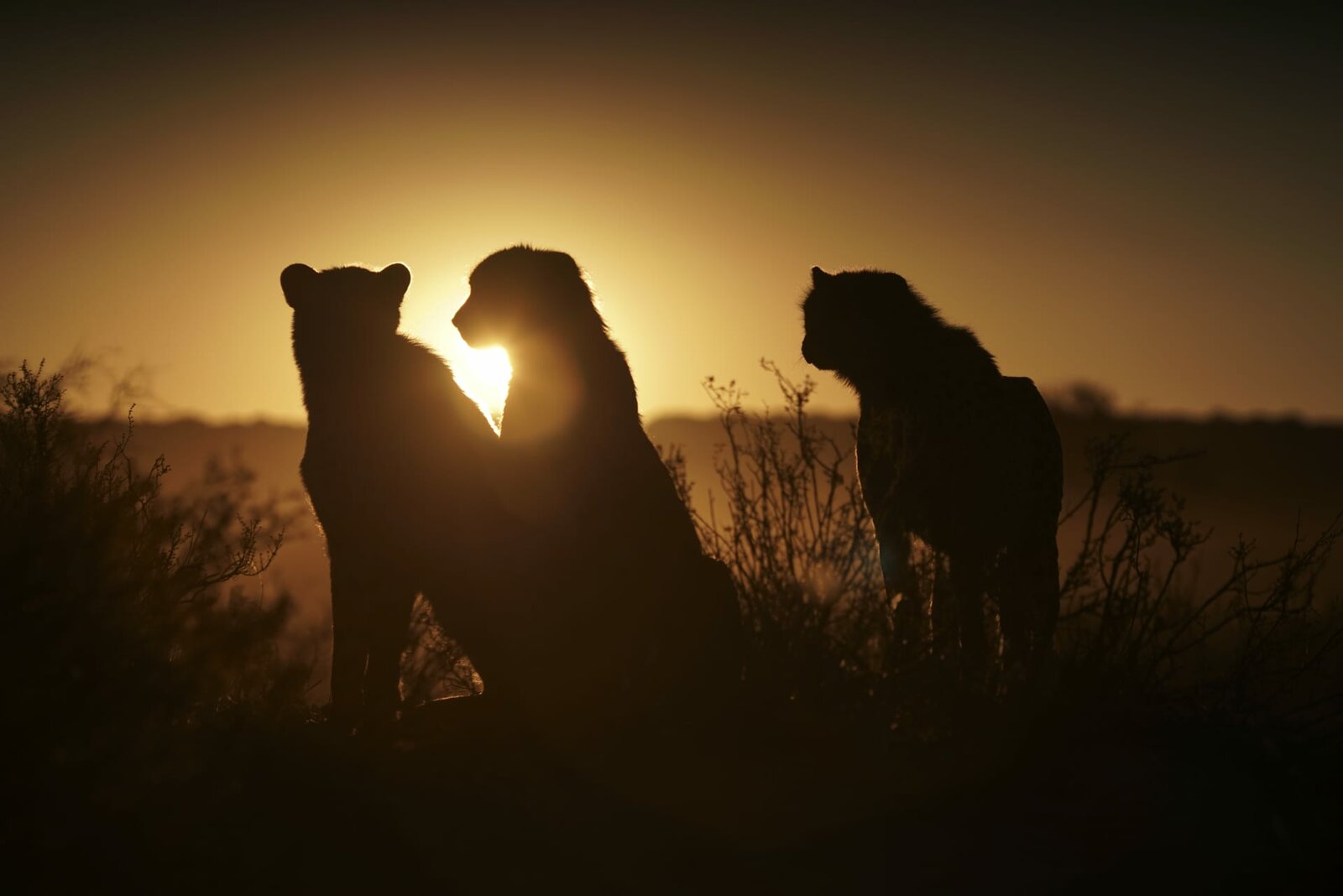 LebenDrei junge Geparden sitzen vor dem SonnenuntergangBild: © NatGeo / Fox