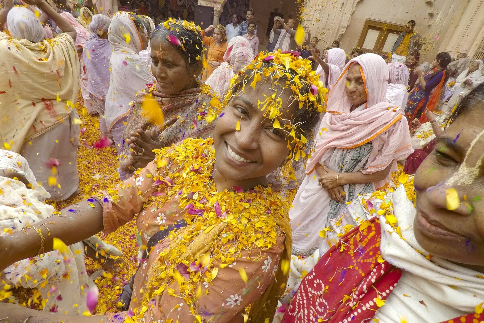 HeimatIn Vrindavan, Indien, feiern Witwen das Fest der Farben im Gopinatti Tempel. Zuerst werden süßriechende Rosen- und Ringelblumenblätter in die Luft geworfen, darauf folgen bunte FarbpulverBild: © National Geographic