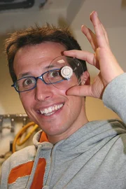 Wer wirft ein Auge auf's Auge?Willi mit einem Rohbrillenglas. Heute darf er einem Optiker über die Schulter schauen, der die Gläser dann in Form bringt.Bild: © BR/megaherz gmbh