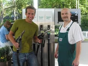 Wie kommt das Erdöl aus der Erde?Von links: Willi und Tankwart Werner, der ihm einige Fragen über Benzin und Diesel beantwortet.Bild: © BR/megaherz
