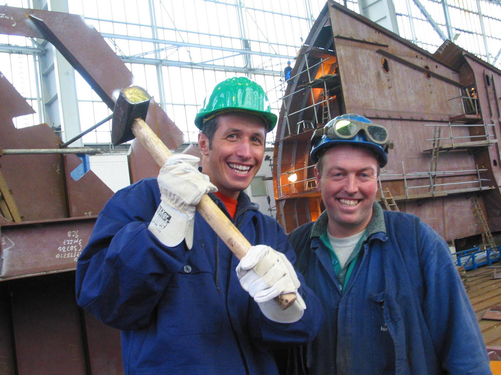 Wo läuft das Schiff vom Stapel?Zusammen mit einem Mitarbeiter der Nordseewerke erkundet Willi (links) die Emdener Schiffswerft.Bild: © BR/megaherz GmbH