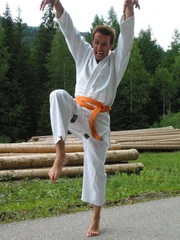 Wer vermöbelt den Wald?Der Moderator Willi Weitzel glaubt, er könne mit Karate versuchen, Holz zu spalten.Bild: © BR/megaherz
