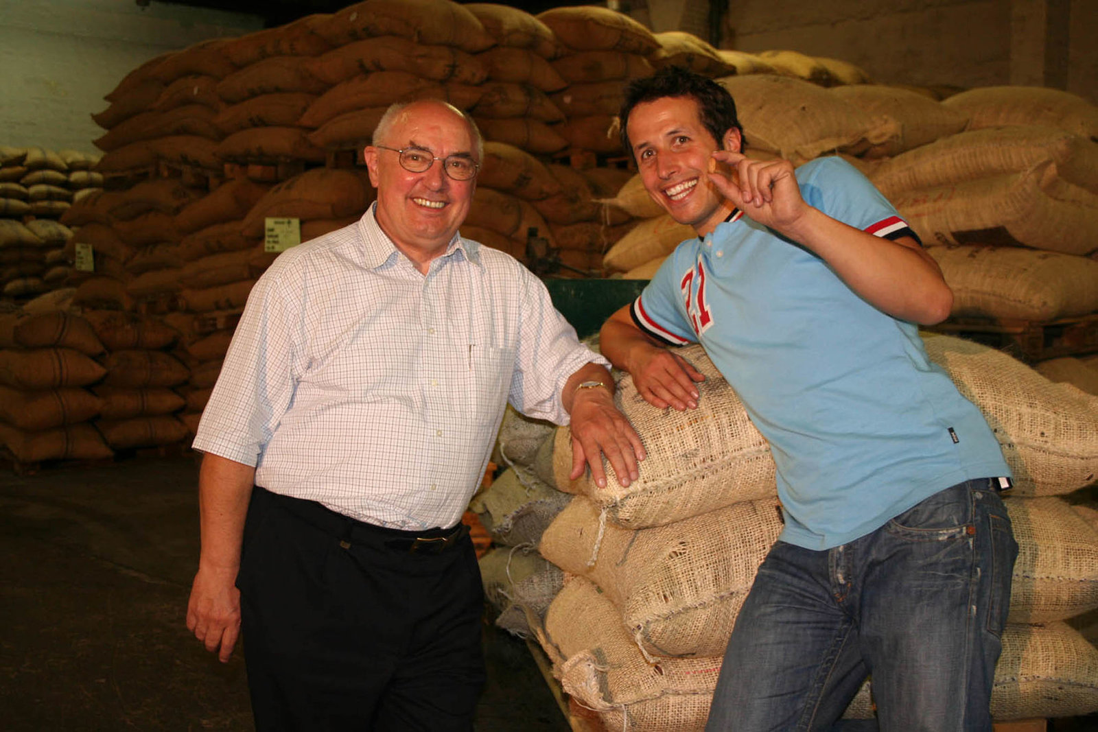 Wie kommt die Schoko in den Laden?Reporter Willi Weitzel (rechts) im Kakaolager in Bremen. Alle Säcke hinter ihm - und das sind immerhin rund 13 000 - sind voll von kleinen Kakaobohnen, wie er eine in der Hand hält. Doch bis daraus Schokolade wird, ist es noch ein weiter Weg.Bild: © BR/megaherz gmbh