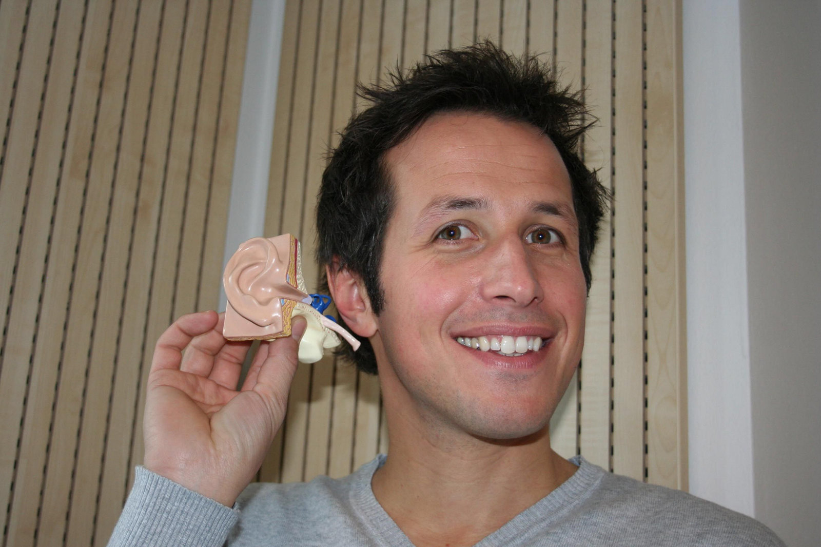 Wer hört mit den Augen?Willi Weitzel mit einem künstlichen Ohrmodell beim Hörgeräteakustiker.Bild: © BR/megaherz gmbh