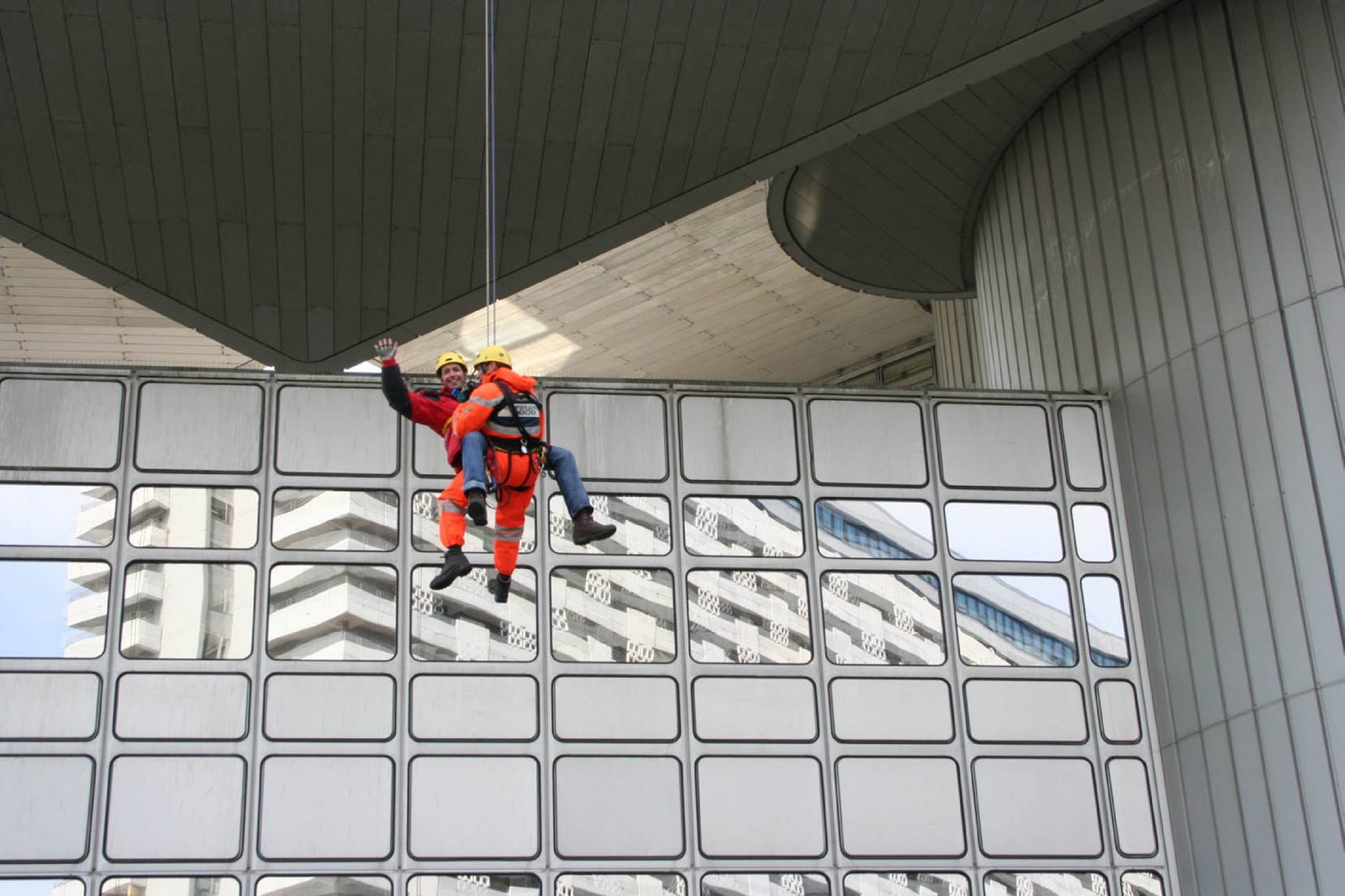 Vorfahrt für die Feuerwehr!Willi Weitzel (links) lässt sich mit Höhenretter Berni von der Berufsfeuerwehr München vom Hypobankgebäude abseilen.Bild: © BR/megaherz