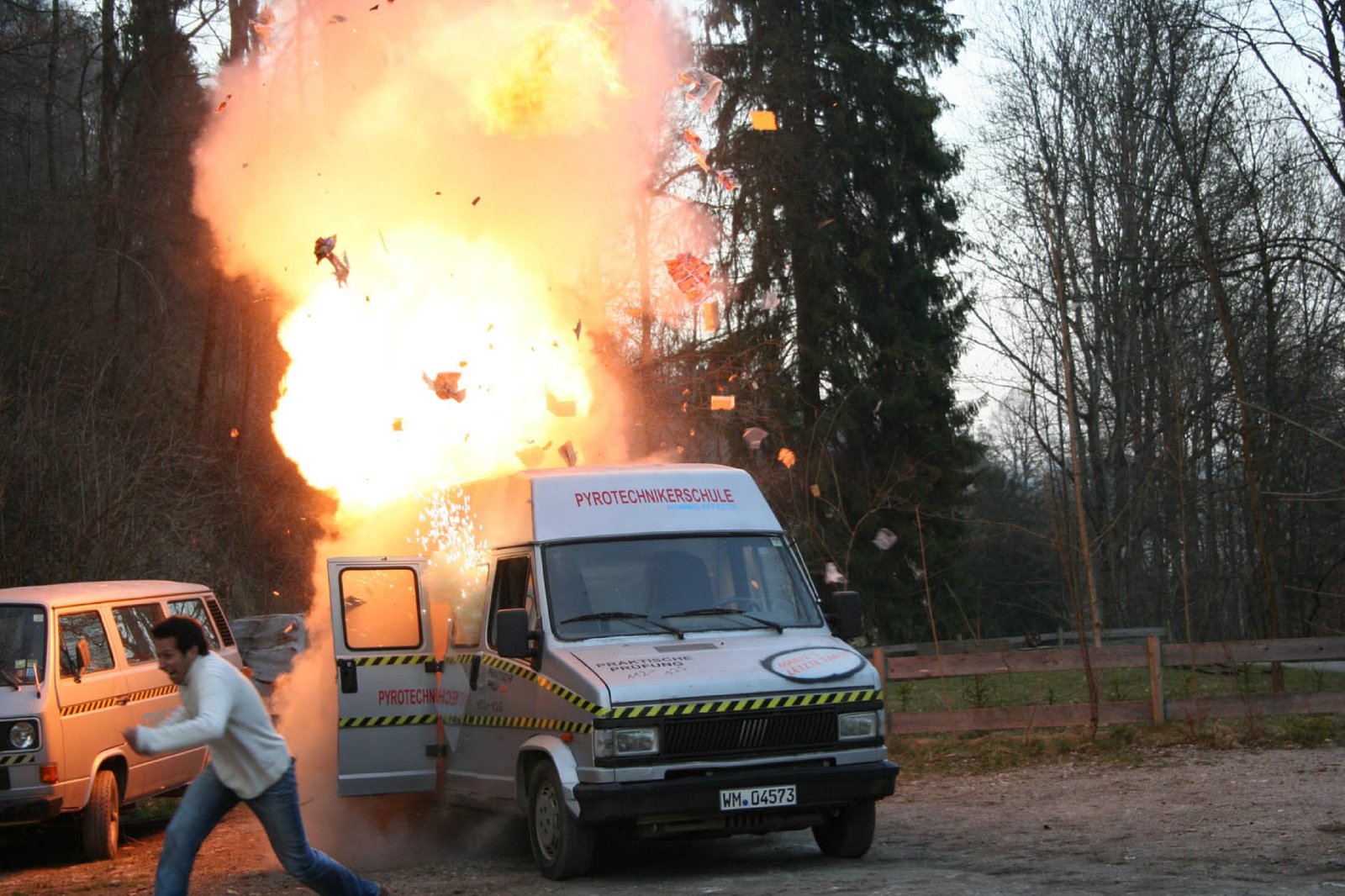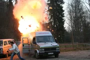 Wo macht es krawumm, dass es kracht?Willi bei einer Autosprengung in der Pyrotechnikerschule Peißenberg. Spezialisten sorgen dafür, dass alles echt aussieht und niemand verletzt wird.Bild: © BR/megaherz gmbh