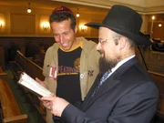 T (Taxifahrer, Tankstelle, Trachten)Willi Weitzel mit Rabbiner Israel Diskin in einer Synagoge. Heute möchte Willi herausfinden, was es bedeutet, jüdisch zu sein.Bild: © BR/megaherz gmbh