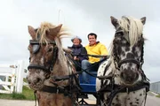 Wer weiß mehr übers Wattenmeer?Kerstin Ketelsen und Willi in einer Pferdekutsche auf der Hallig Hooge. Bei Sturmflut stehen hier die Wiesen und Wege unter Wasser.Bild: © BR/megaherz gmbh