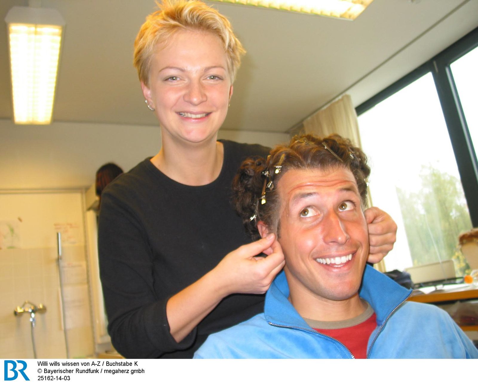 K (Kaninchensport, Korbflechter, Kulissen)Rumpelnd und pumpelnd gibt die Buchstaben-Mischmaschine den Buchstaben für diese Sendung vor: K wie König-Ludwig-Musical. Willi darf dort als König Ludwig II. auf die Bühne. Dafür bekommt er von Bianca eine Perücke verpasst.Bild: © BR/megaherz gmbh