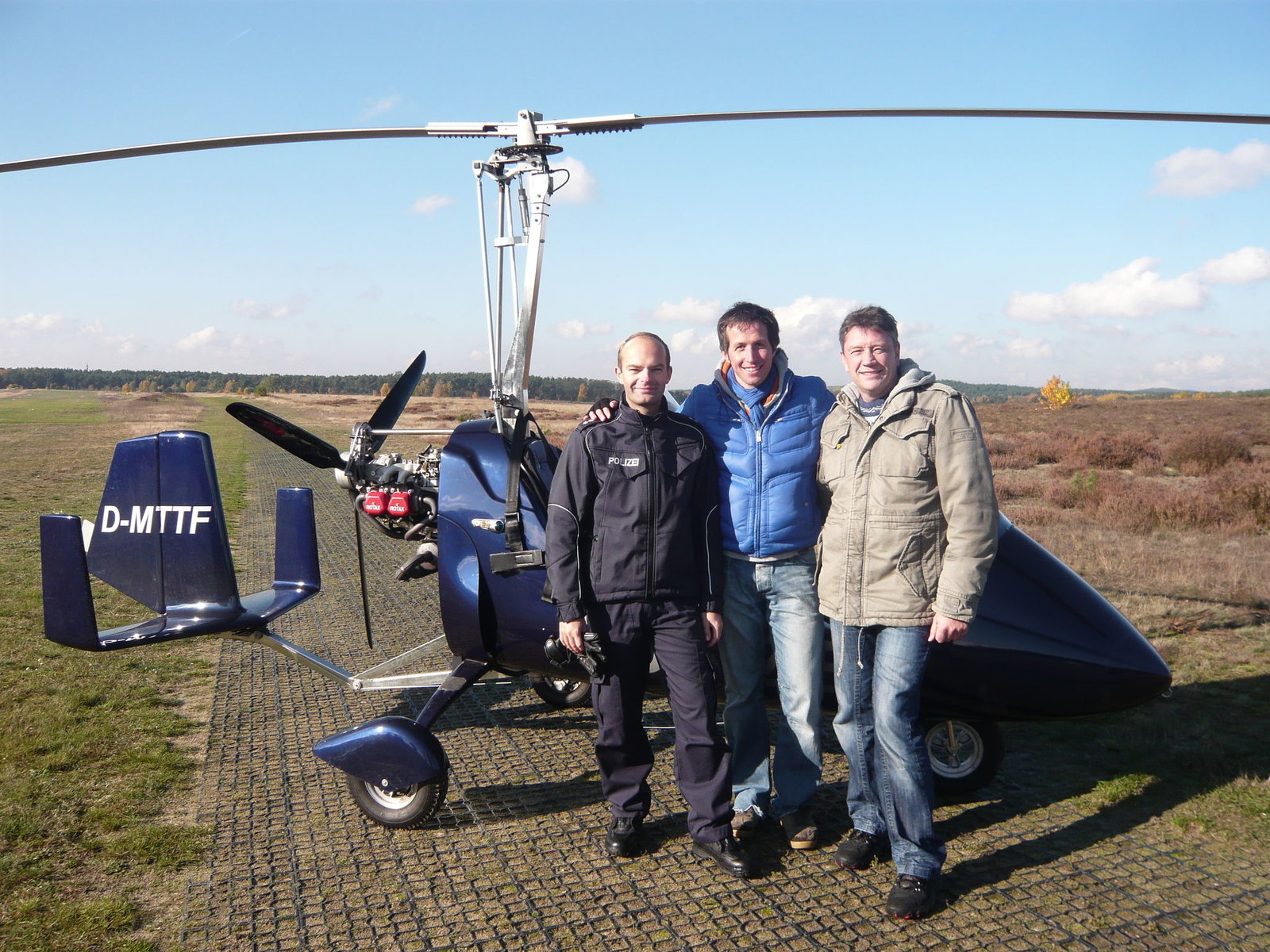 Tolle Technik - Rettung aus der Luft!Von links: Polizist Sebastian Seidl, Willi und Pilot Achim Grütz vor einem Gyrocopter.Bild: © BR/megaherz gmbh