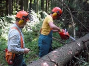 Wer hegt und pflegt und sägt im Wald?Willi Weitzel (rechts) interessiert sich für die Pflege des Waldes. Forstmeister Hermann erklärt ihm die Grundlagen der Hölzfällerei.Bild: © BR/megaherz