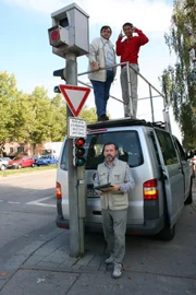 Sicher hin und her im Straßenverkehr!Willi mit Verkehrspolizisten Willi und Heinz an einer Blitzampel in München. Wer hier bei Rot fährt, da kann es richtig teuer werden.Bild: © BR/megaherz gmbh