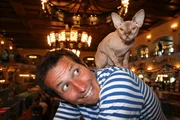 Achtung, wilde Miezekatzen!Willi hat bei einer Katzenausstellung im Löwenbräukeller München eine Nacktkatze auf dem Buckel.Bild: © BR/megaherz